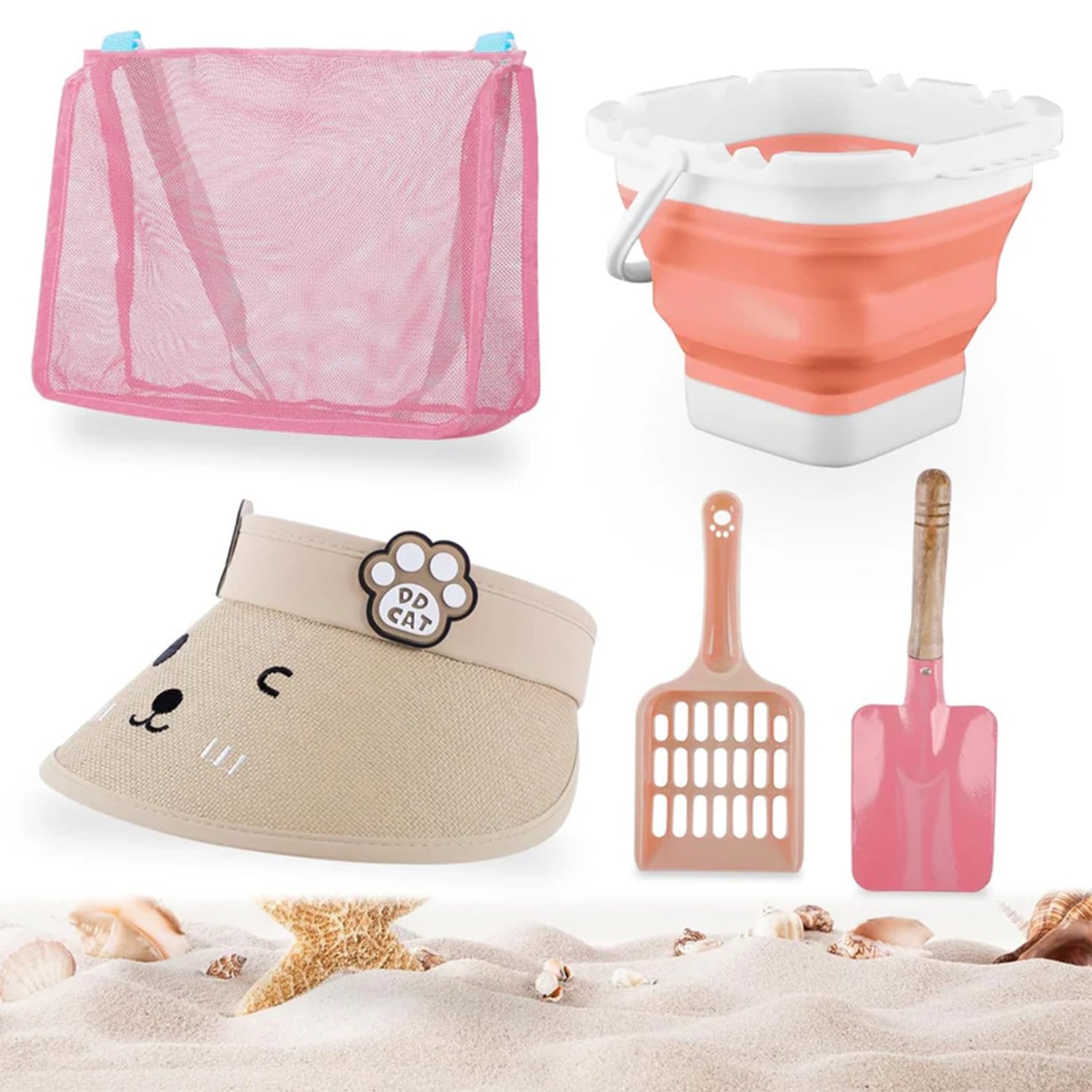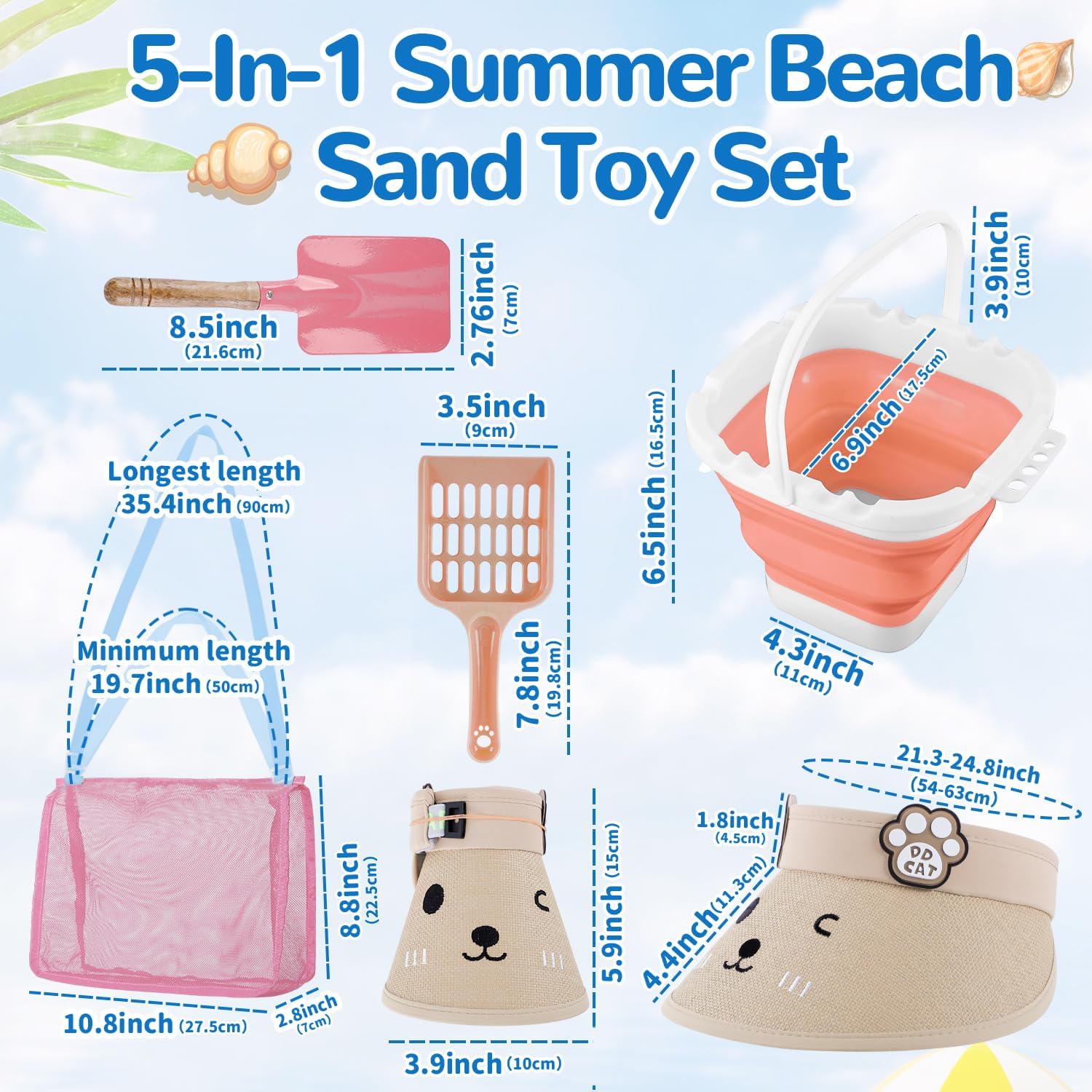 - 🏖️ 5-in-1 Beach Bliss: This summer beach toys set comes with 1 x roll-up sun visor, 1 x foldable beach bucket, 1 x mesh beach bag, 1 x sand shovel, 1 x sand scoop, is your go-to bundle for endless beach vacation fun, ensuring a day of joyful play and safe fun.