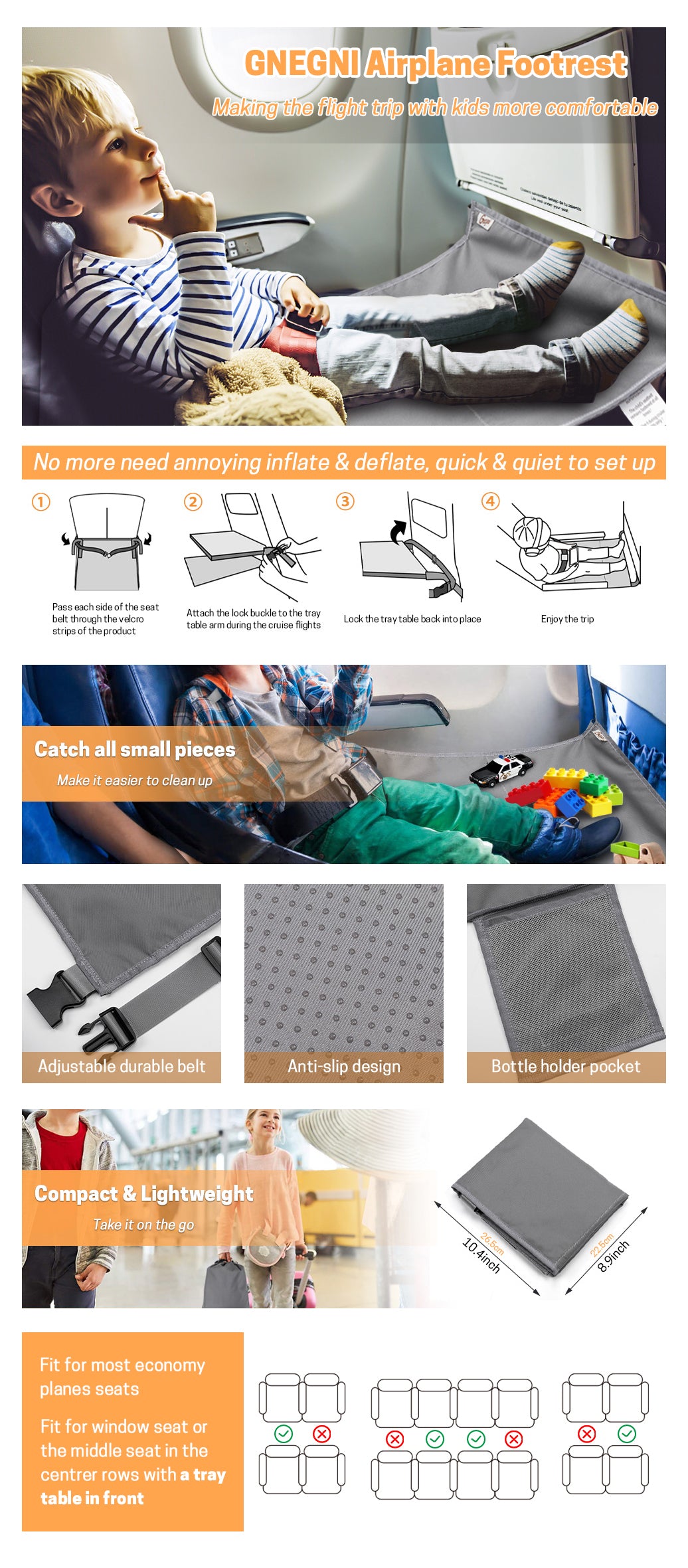 - ✈ Compatible with most airplane seats: Designed as a toddler airplane seat extender to hold small children's legs only, Gnegni Kids Airplane Footrest is to be used in the window seat or the middle seat in the center rows with a tray table in front. Cannot be used in bulkhead seats, aside seats, and exit row seats.
